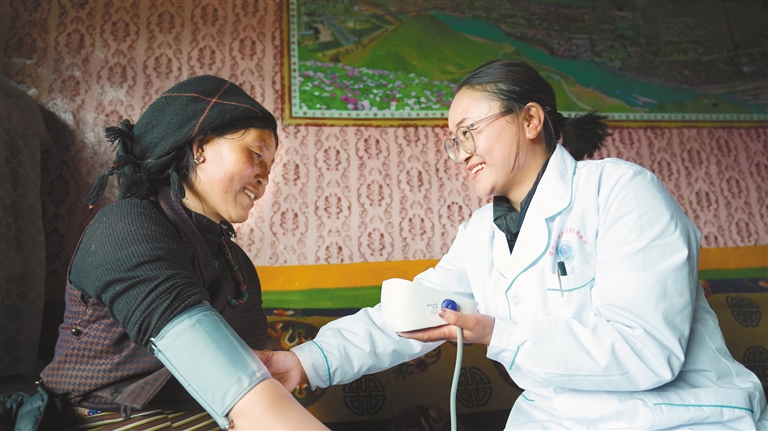 家庭簽約醫(yī)生為群眾測量血壓。