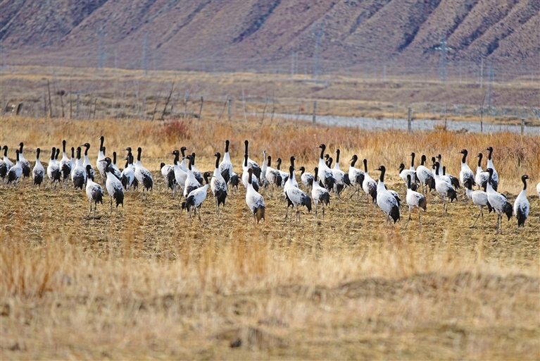 黑頸鶴在墨竹工卡縣唐加鄉(xiāng)拉東村農(nóng)田里棲息。