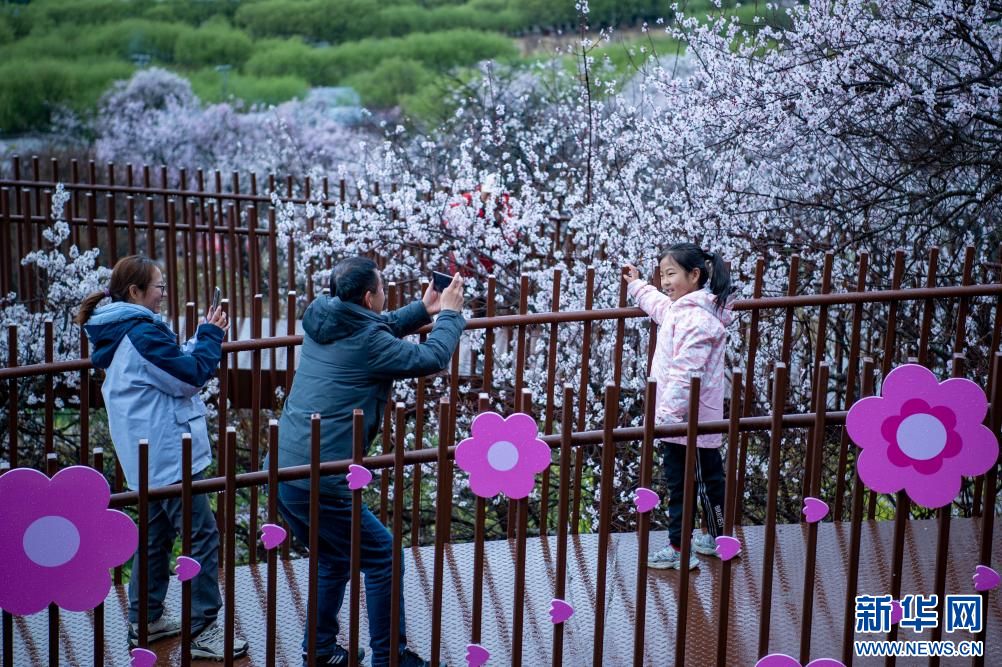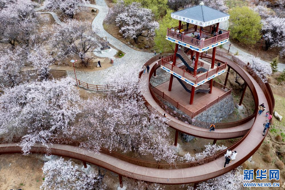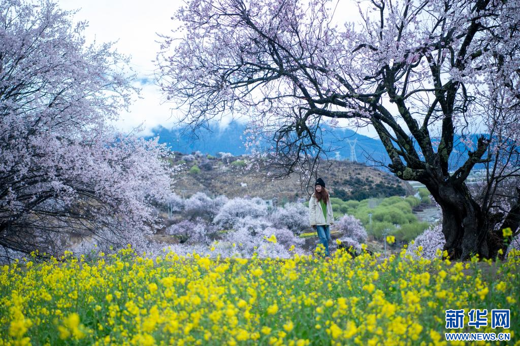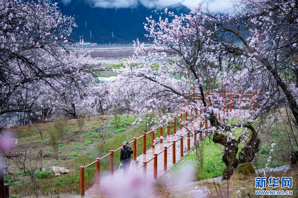 4月3日,游客在林芝市巴宜區(qū)嘎拉村賞桃花。新華網(wǎng) 旦增努布 攝