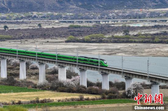 據(jù)悉,拉林鐵路是一條連接西藏拉薩市與林芝市的國鐵Ⅰ級單線電氣化鐵路,全長435公里,設(shè)計時速160公里,于2021年6月25日開通運營。圖為穿梭在桃花林中的拉林鐵路高原復(fù)興號。