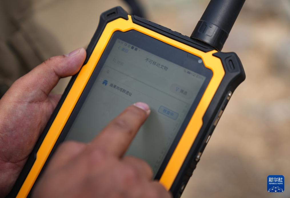 4月11日,普查人員手持移動端數(shù)據(jù)采集設(shè)備在曲果崗塔群遺址現(xiàn)場開展數(shù)據(jù)采集。新華社記者 晉美多吉 攝