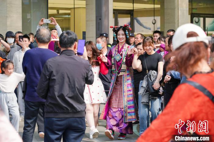 此次文旅推廣活動中,主辦方在西子湖畔舉辦了一場藏裝時裝秀,十多位拉薩市當(dāng)雄縣藝術(shù)團(tuán)的演職人員身著各式藏裝獻(xiàn)上文藝表演、時裝走秀,吸引廣大游客駐足參與互動。