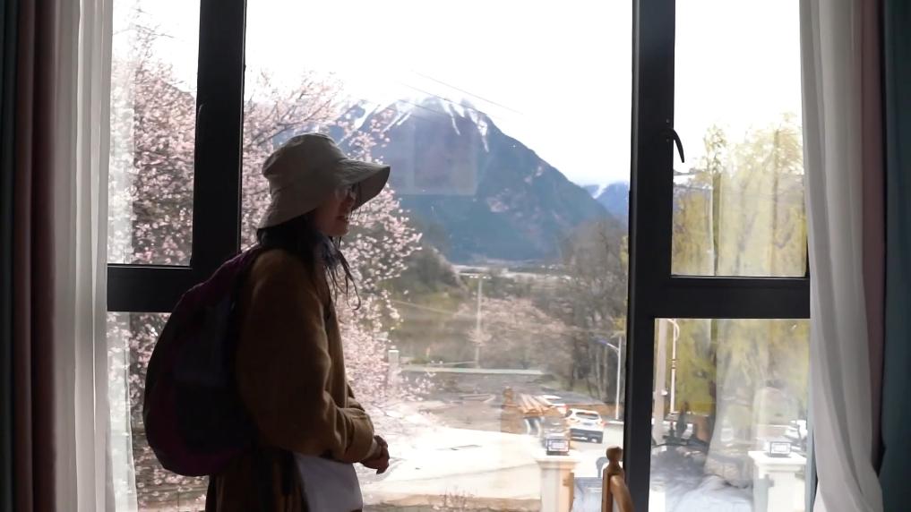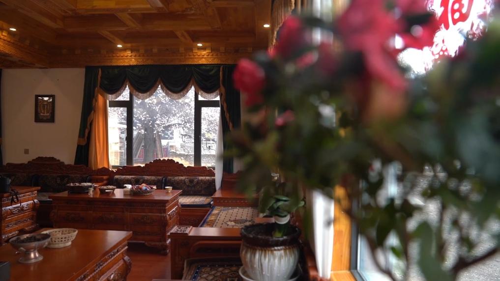 下午4點(diǎn),林芝市波密縣傾多鎮(zhèn)古通村,遠(yuǎn)來(lái)的游客入住到村民洛松頓珠開(kāi)辦的民宿。寬敞的客廳里,藏式家具整齊大氣,窗外古老的桃花樹(shù)隨風(fēng)散落著陣陣花雨。