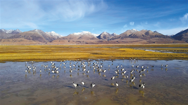 數(shù)量逐年增多的黑頸鶴成群遷徙停歇或繁殖,正是對當雄縣生態(tài)環(huán)境持續(xù)向好的最美注腳。當雄縣自然資源局(林業(yè)和草原局)局長楊光富說:“近年來,當雄縣始終堅持‘綠水青山就是金山銀山、冰天雪地也是金山銀山’的發(fā)展理念,率先在拉薩市成功創(chuàng)建全國生態(tài)文明示范縣和‘兩山’實踐創(chuàng)新基地。這兩塊金字招牌充分體現(xiàn)了當雄的生態(tài)底色。下一步,我們將在全縣草原生態(tài)保護中重點突出阿熱濕地保護,探索濕地黑頸鶴、斑頭雁等珍稀野生動物活動的特點規(guī)律,促進濕地保護管理與濕地資源合理利用有機融合,確保探索形成守綠換金、添綠增金、點綠成金的‘兩山’轉(zhuǎn)化模式。”