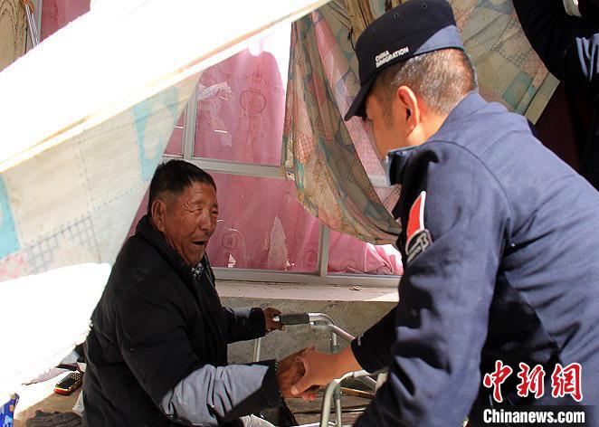 圖為桑珠老人為上門(mén)服務(wù)的民警連聲道謝。次仁頓珠 攝