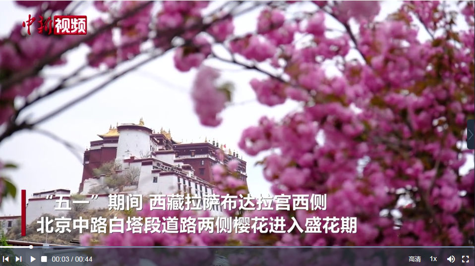 “五一”期間,西藏拉薩布達(dá)拉宮西側(cè)北京中路白塔段道路兩側(cè)櫻花進(jìn)入盛花期,花枝爛漫,引來不少過往市民、游客駐足拍照“打卡”。北京中路附近正好有個公交站臺白塔站,市民、游客可花下乘車,春夏之交,高原景色宜人。(記者 江飛波 制作 劉鵬)