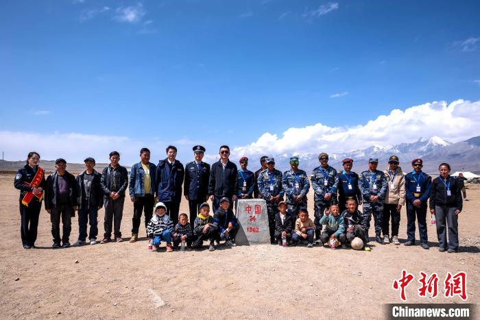 圖為在中尼24號(hào)界樁處合影留念。陳文超 攝