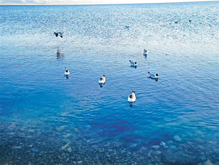 圖為納木錯湖面上的棕頭鷗。