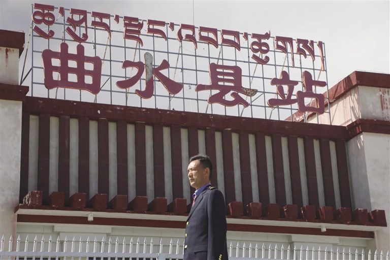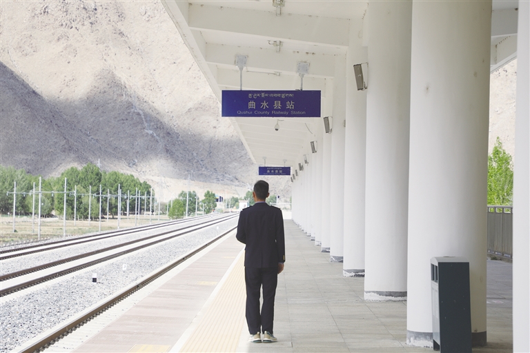 每天,清晨的第一縷陽光還未穿透遠(yuǎn)方的山巒時,車站值班員賀文貴已經(jīng)站在曲水站的站臺上,開始了他日復(fù)一日的工作,查看股道是否有異物,是否有動物進入站場。曲水站與其他站不一樣,根據(jù)工作安排,平時這里只有一個人當(dāng)班應(yīng)急值守,沒有旅客上下站,時而駛過的火車,是這里唯一的來客。目之所及,只有遠(yuǎn)處的雪山、農(nóng)田和滾滾向前的雅魯藏布江水。