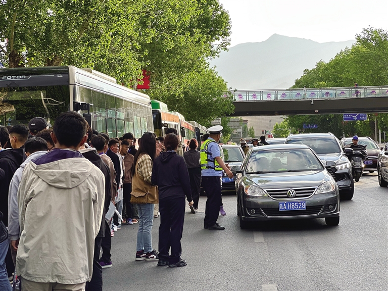 6月7日8點(diǎn),太陽剛剛升起,拉薩中學(xué)考點(diǎn)附近人頭攢動。一輛輛愛心送考的公交車依次??吭隈R路邊,學(xué)生們排隊(duì)等候安檢進(jìn)場,考點(diǎn)大門口的喇叭重復(fù)播放著考生進(jìn)考場的溫馨提示。