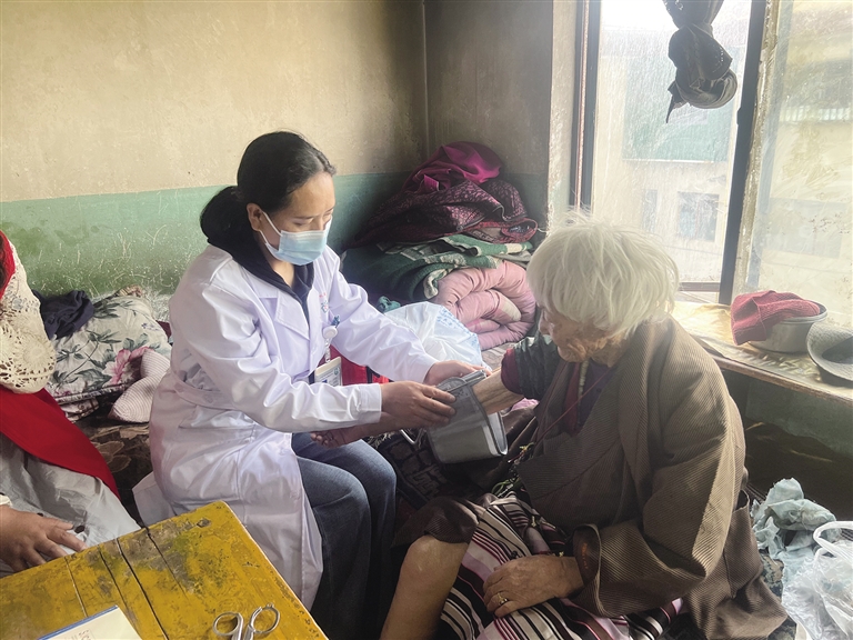 跟隨林聚社區(qū)黨支部書記扎西尼瑪?shù)哪_步,記者走進(jìn)一戶人家??蛷d中,一位頭發(fā)花白、身形佝僂的老人正側(cè)躺在沙發(fā)上閉目養(yǎng)神。老人名叫仁措,今年已經(jīng)94歲??匆娫髂岈?shù)絹?,兩人親切地拉起了家常。細(xì)心詢問老人的身體狀況后,扎西尼瑪和社區(qū)工作人員便開始為老人打掃房間。因老人行動不便,廁所有些污垢,工作人員仔細(xì)進(jìn)行了清理。隨后,工作人員將老人的臟衣服全部收集拿回社區(qū)清洗。見到老人精神有些不佳,扎西尼瑪叫來社區(qū)的衛(wèi)生服務(wù)隊為老人檢查身體。