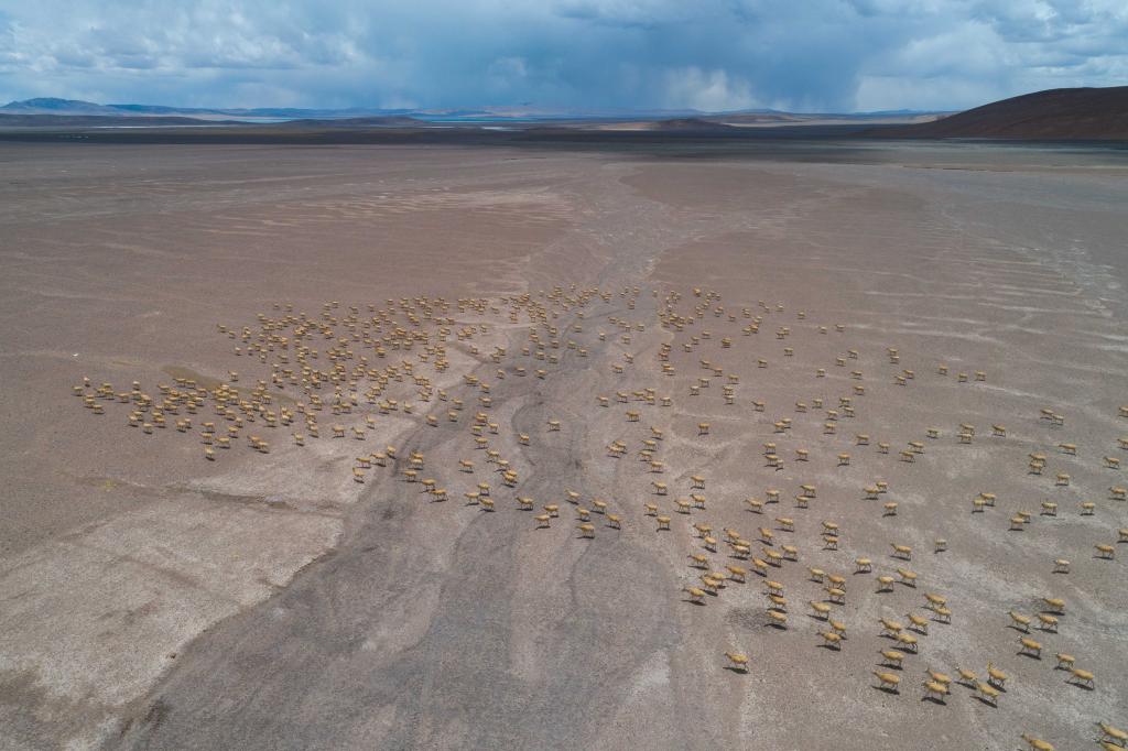 大群遷徙的藏羚羊途經(jīng)甜水河畔的荒灘雪地,向著產(chǎn)羔地遷徙(6月15日攝)。新華社記者 姜帆 攝
