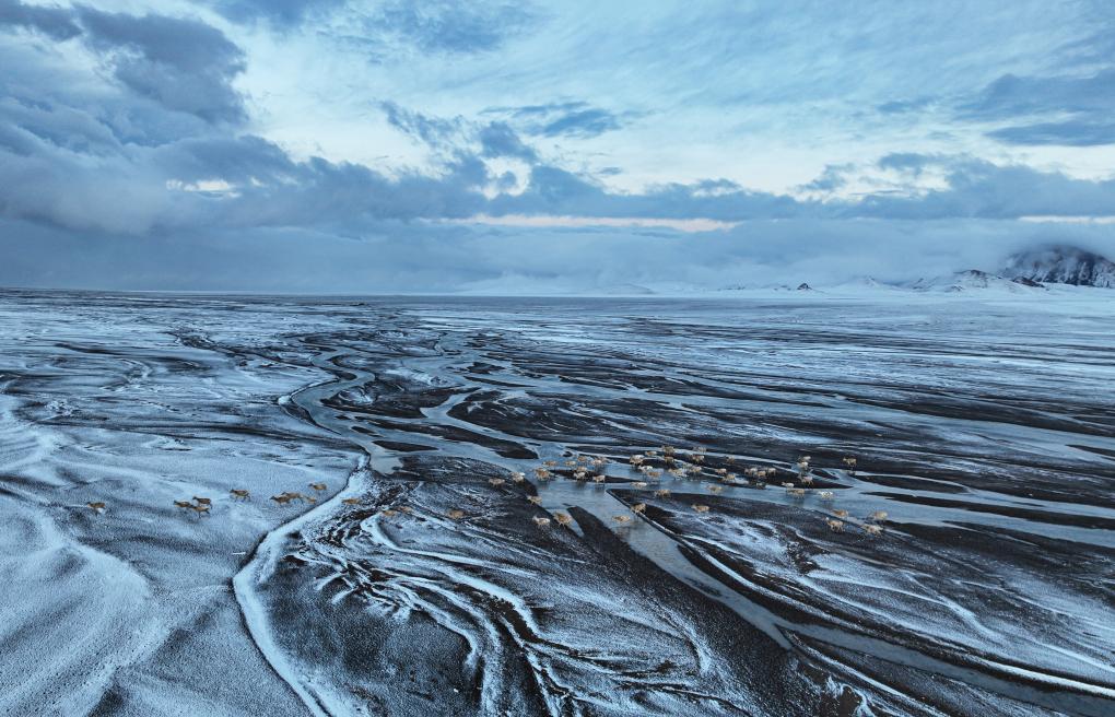 這是在甜水河畔荒灘雪地中向產(chǎn)羔地遷徙的藏羚羊(6月14日攝 無(wú)人機(jī)照片)。新華社記者 普布次仁 攝