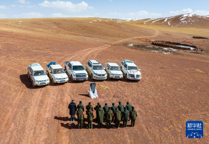 野生動物專業(yè)管護(hù)隊員們在無人區(qū)深處的羅布玉杰烈士紀(jì)念碑前默哀致敬(無人機(jī)照片,5月10日攝)。 新華社記者 姜帆 攝