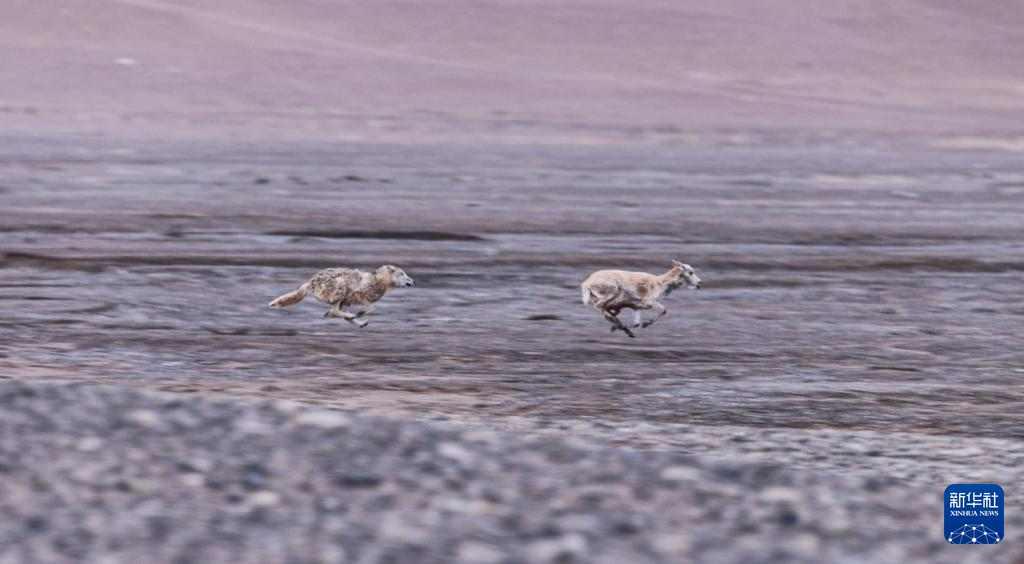 在羌塘國家級自然保護區(qū),一只雄性藏羚羊奔向雌性(2023年12月16日攝)。新華社記者 姜帆 攝