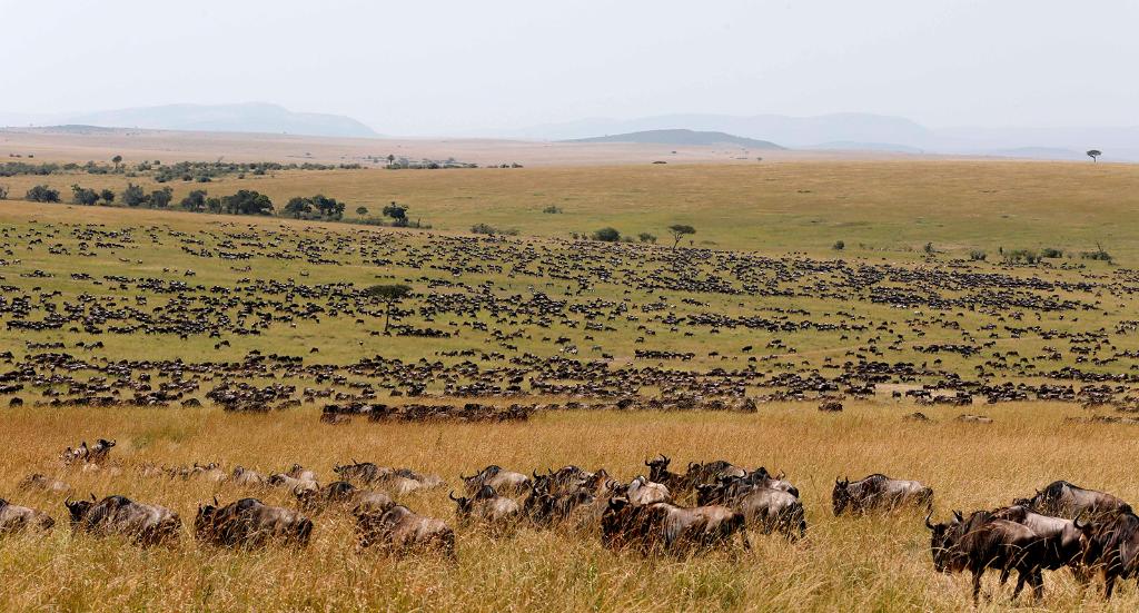 ↑ 在馬賽馬拉國家保護(hù)區(qū),遷徙中的野生動(dòng)物在草原上覓食。