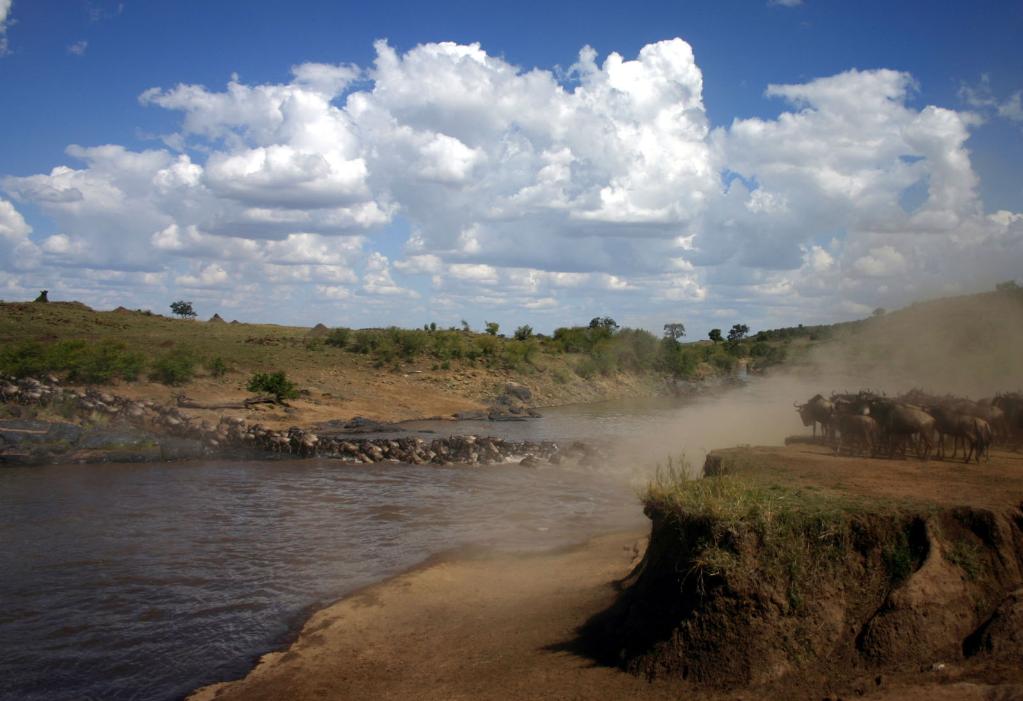 ↑ 在馬賽馬拉國家保護(hù)區(qū),遷徙中的角馬越過馬拉河。馬拉河“生死之渡”是整個(gè)大遷徙過程中最為壯觀和驚心動(dòng)魄的一幕。