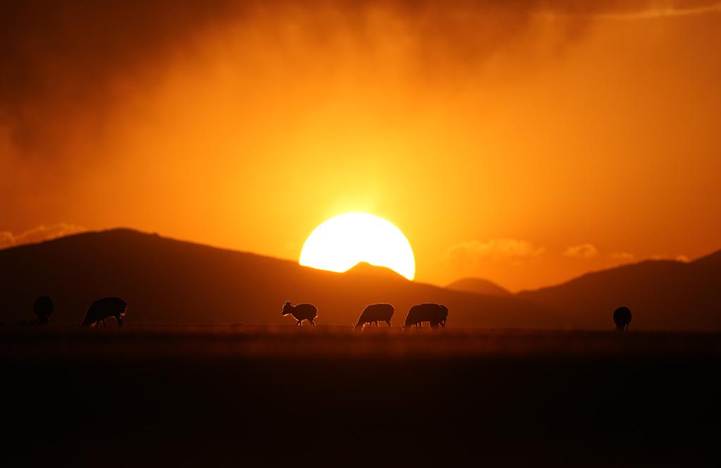 ↑ 在羌塘國家級(jí)自然保護(hù)區(qū),藏羚羊在夕陽下覓食。