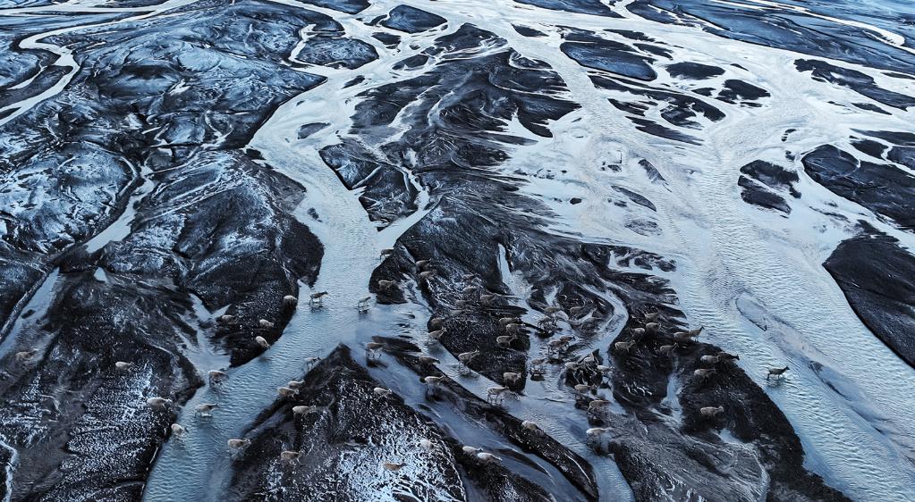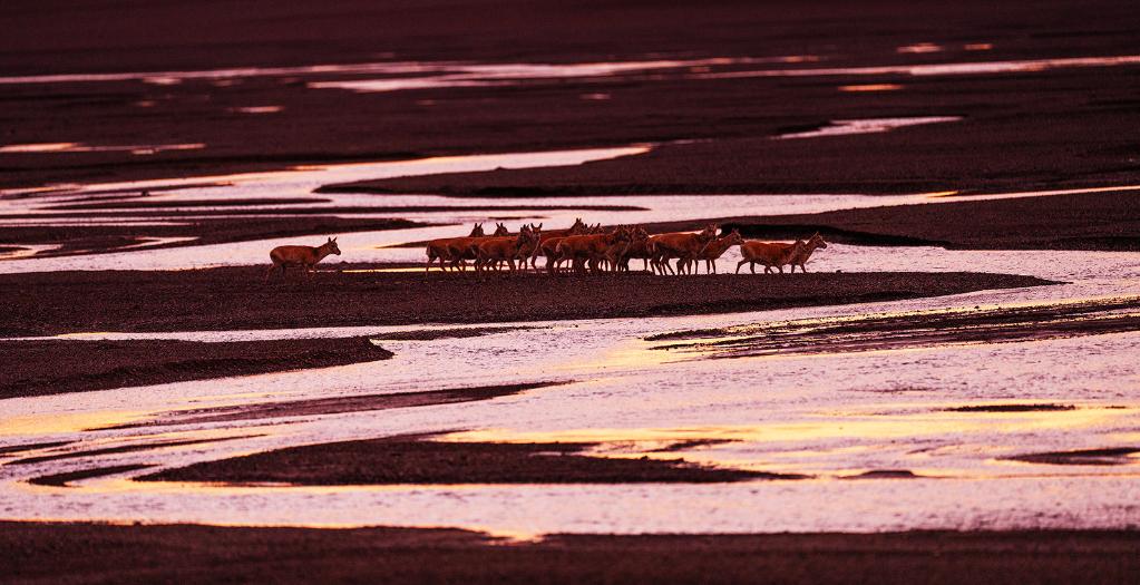 ↑ 在羌塘國家級(jí)自然保護(hù)區(qū),藏羚羊越過甜水河,前往“產(chǎn)房”。