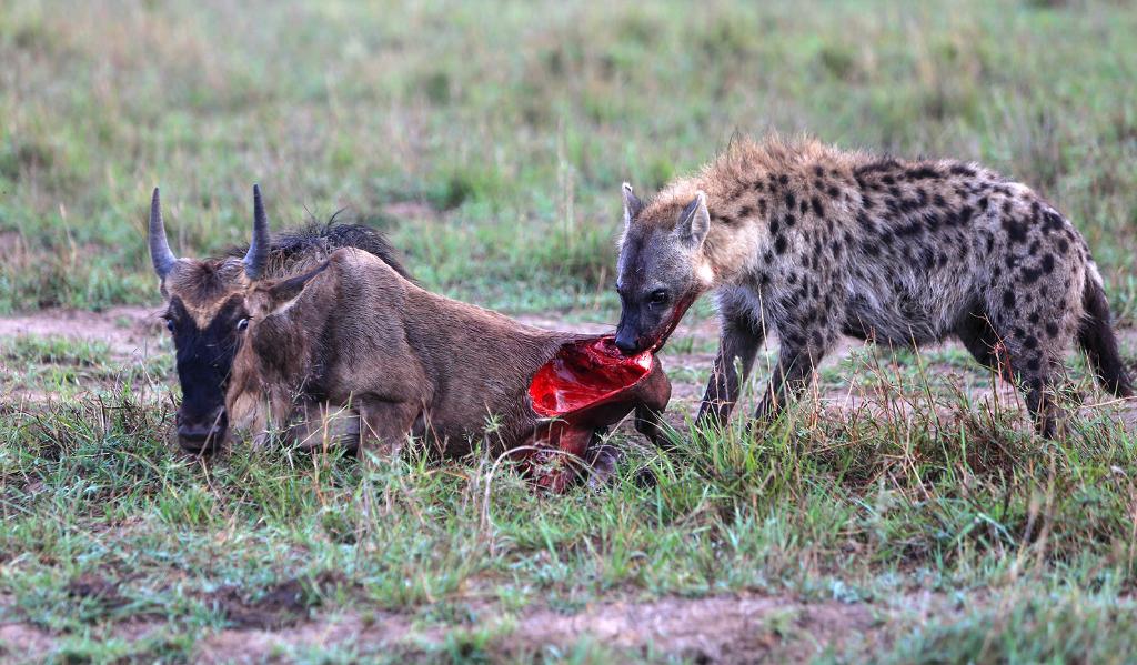 ↑ 在馬賽馬拉國家保護(hù)區(qū),一頭遷徙中的角馬成了鬣狗的食物。在角馬遷徙過程中,獅子、獵豹、花豹、鬣狗以及馬拉河中的鱷魚等掠食動(dòng)物環(huán)伺其周,伺機(jī)而動(dòng)。