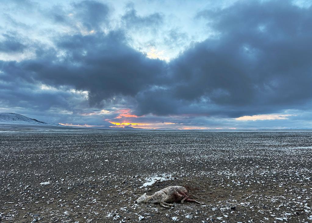 ↑ 在羌塘國家級(jí)自然保護(hù)區(qū),一只被野狼咬死的母藏羚羊躺在雪后的草原上。