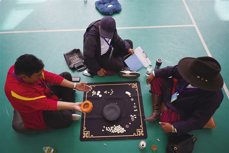 當日,“吉韌”“秀茲”等項目一同開賽?! 凹g”也叫藏式克郎球,是藏族的一種彈指運動。比賽在一張邊長約1米的正方形木桌球臺上進行,球臺四角有4個小洞,黑、白兩種扁圓形球子各9個,另有1個紅色球子放置在球臺中心,1個白色母球供雙方彈擊球子所用。