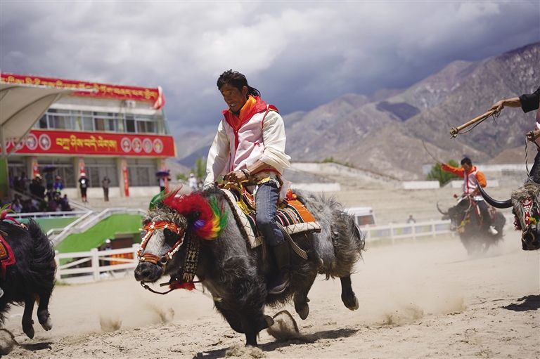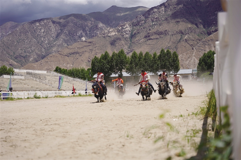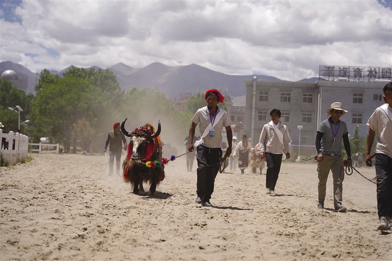 此時,賽場另一邊傳來歡呼,循聲望去,原來是本屆運動會的賽牦牛正在進行。雖然牦牛生性溫和,但讓它們聽命令奔跑,也并不容易。記者了解到,參加本屆運動會的牦牛均由主人精挑細選,主人一聲吹哨,輕微地蹬腳,牦牛就會按指令向前行進,顯得默契十足。但偶爾也會發(fā)生小狀況,比如牦牛分不清方向擠成一團,跑著跑著就停頓休息,或者原路返回等,引得觀眾頻頻發(fā)笑。