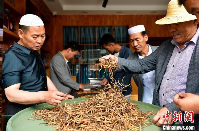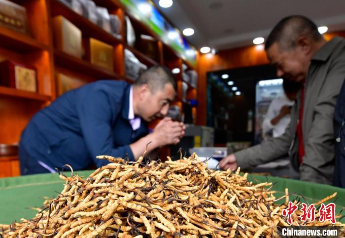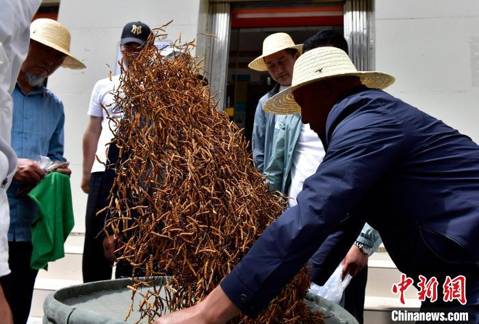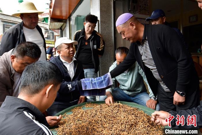 圖為7月16日,蟲(chóng)草商們?cè)诿硐伦h價(jià)。中新社記者 李林 攝