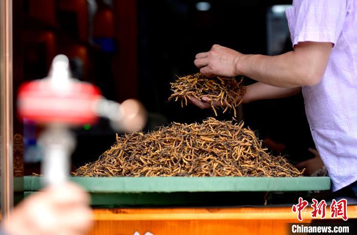 圖為7月16日,蟲(chóng)草商張華平正在展示店內(nèi)的蟲(chóng)草。中新社記者 李林 攝