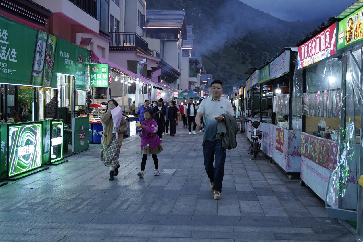 公園旁邊的幸福夜市吸引了很多當?shù)厝罕姾陀慰?。重慶燒烤、陜西肉夾饃、東北冷面……來自全國各地的特色美食,漫步在美食街,香味縈繞,人心暖暖。