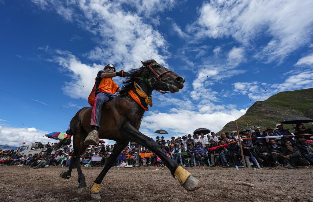 23日,在拉薩林周縣甘旦曲果鎮(zhèn)江角村的賽馬場上,選手邊瑪益丹穿著輕便的馬術(shù)運動服,上身貼緊棕色馬背,右手的馬鞭在空中打著旋,和他的愛馬進行最后沖刺。