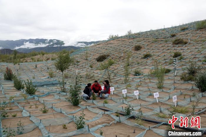 山南市全國防沙治沙綜合示范區(qū)(桑耶核心區(qū)),中國科學院成都山地所科研人員現(xiàn)場查看并交流。中新網(wǎng)記者孫自法攝