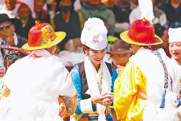 在邊交林鄉(xiāng)當杰村“望果節(jié)”活動現(xiàn)場,隨著激昂的《運動員進行曲》,當杰村“平措林望果節(jié)”活動拉開帷幕,38名馬術(shù)運動員、38名射箭運動員在2萬多名觀眾的歡呼聲中邁入現(xiàn)場。