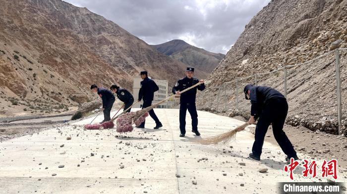 圖為普蘭邊檢民警清理落入公路上的碎石。鐘悅祺 攝