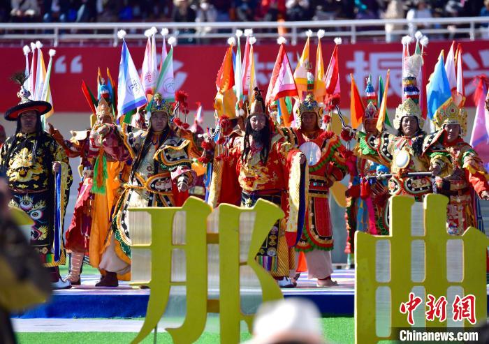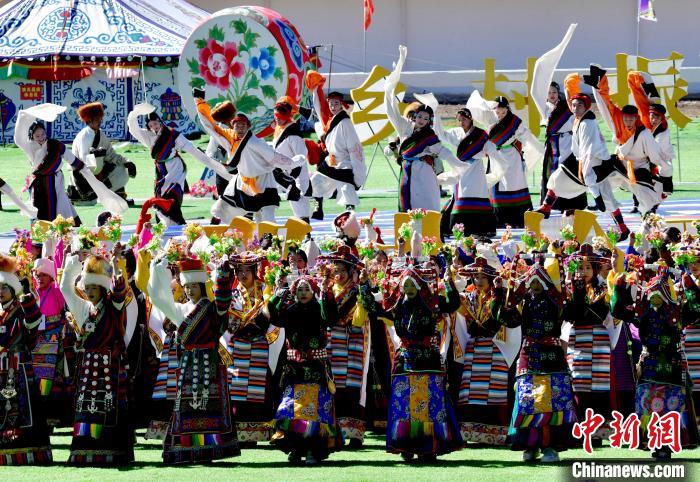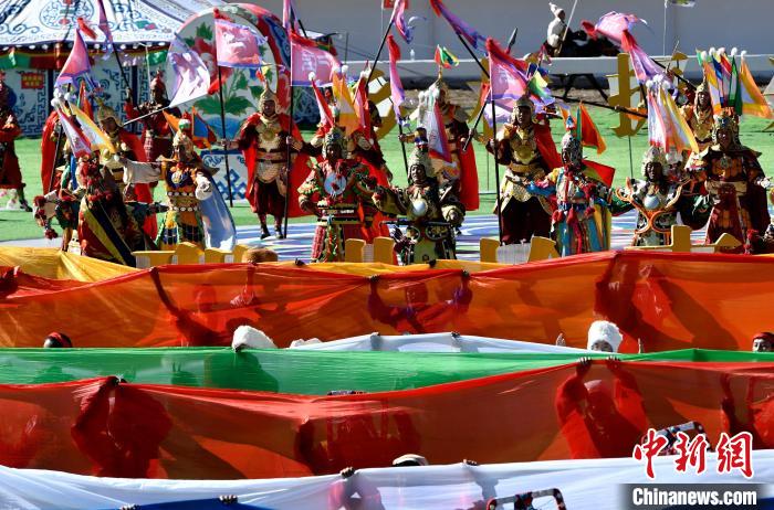 8月10日,2024年那曲恰青賽馬節(jié)暨第三屆“鄉(xiāng)村振興 那曲奮進”活動開幕式在那曲市賽馬場舉行,精彩的文藝歌舞、馬術表演等展示著羌塘草原上的無窮魅力和活力。圖為開幕式文藝表演現(xiàn)場。中新社記者 李林 攝