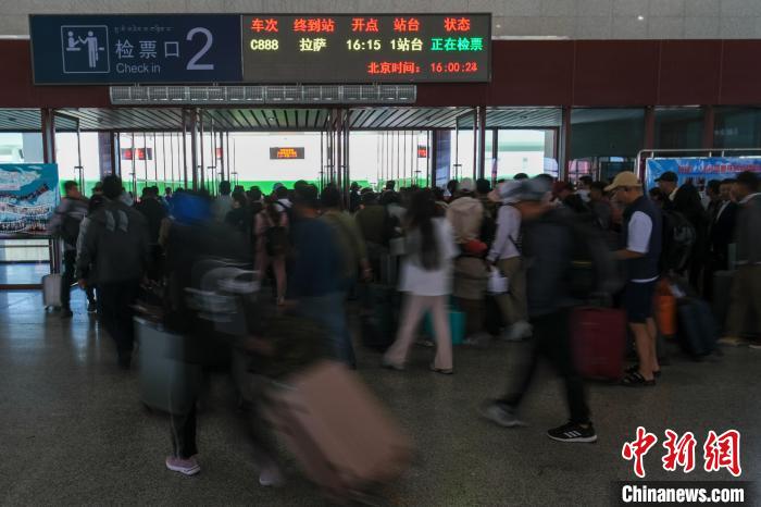8月16日,西藏拉日鐵路通車十周年。作為連接拉薩與日喀則間的高原城際鐵路,十年來(lái),拉日鐵路運(yùn)送旅客超1429萬(wàn)人次,運(yùn)送貨物超524萬(wàn)噸。圖為16日,西藏拉日鐵路日喀則站內(nèi),旅客檢票乘車前往拉薩。中新社記者 江飛波 攝