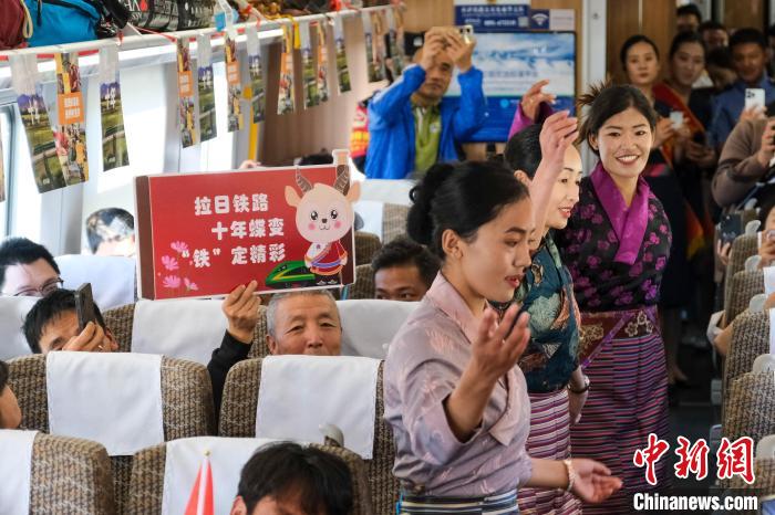 8月16日,西藏拉日鐵路通車十周年。作為連接拉薩與日喀則間的高原城際鐵路,十年來(lái),拉日鐵路運(yùn)送旅客超1429萬(wàn)人次,運(yùn)送貨物超524萬(wàn)噸。圖為16日,中國(guó)鐵路青藏集團(tuán)有限公司職工在C885次動(dòng)車組列車上表演鍋莊舞,與乘客共同慶祝拉日鐵路通車十周年。中新社記者 江飛波 攝