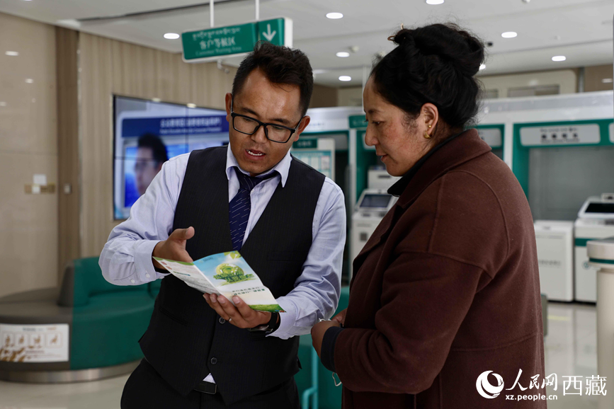 農(nóng)行洛扎縣支行工作人員在向辦事群眾講解“個(gè)人碳賬戶(hù)”。人民網(wǎng)記者 次仁羅布攝