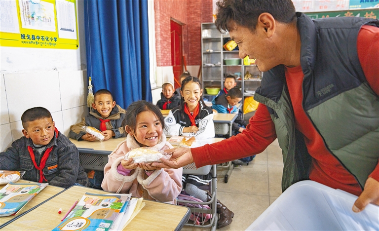西藏那曲市班戈縣中石化小學(xué)是目前全國海拔最高的援藏小學(xué),由中石化集團(tuán)結(jié)對幫扶建立,2012年投入使用。圖為班戈縣中石化小學(xué)后勤副校長尼旦為學(xué)生們分發(fā)營養(yǎng)餐(資料圖片)。新華社記者 丁增尼達(dá) 攝