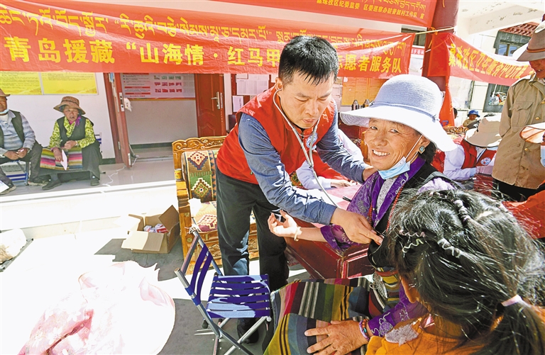 圖為青島援藏組“山海情·紅馬甲”醫(yī)療志愿者服務(wù)隊(duì)為日喀則市桑珠孜區(qū)群眾義診。記者 李洲 攝