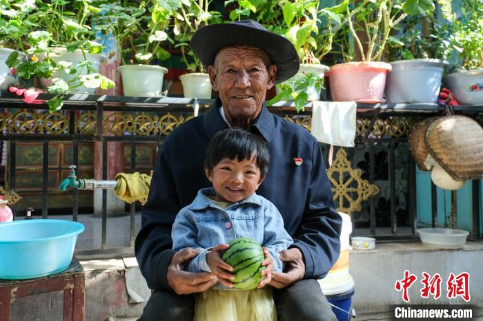 現(xiàn)年77歲的邊巴頓珠是彭倉(cāng)村種大棚“第一人”。圖為8月23日,邊巴頓珠和孫女抱著一個(gè)自家種出來(lái)的大棚西瓜。記者 江飛波 攝