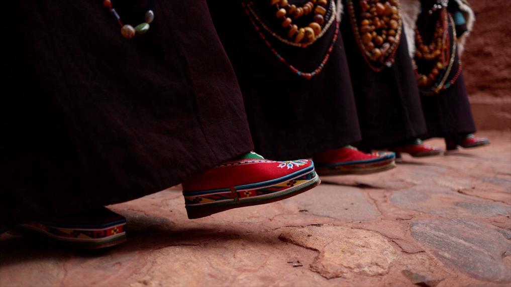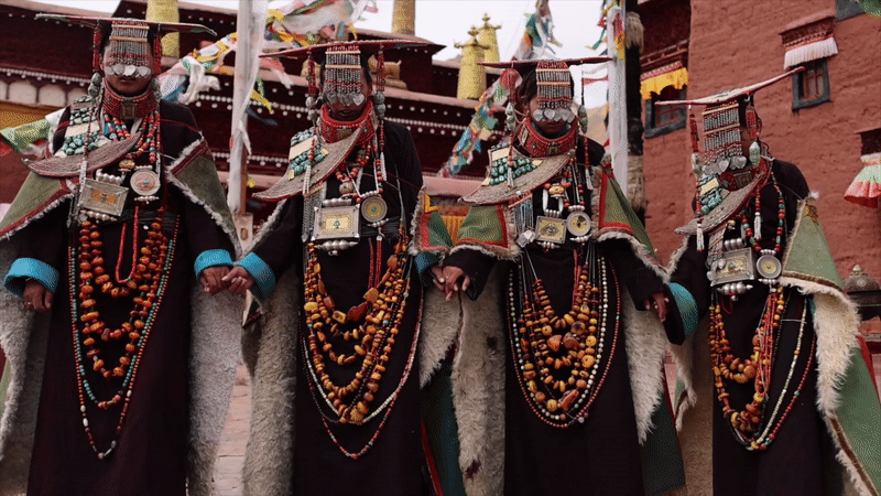 普蘭縣科迦村里有7戶人家保存著7套祖?zhèn)鞣棧惶字剡_25公斤,裝飾有黃金、白銀、松石、瑪瑙、珊瑚、珍珠等,承載和沉淀了百年時光,堪稱“穿在身上的千年史”。