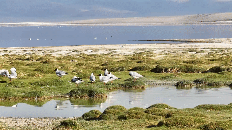 在扎日南木錯湖西北處的淡水淺灘區(qū)生長著茂密的水草和藻類,形成適合鳥類棲息的生態(tài)濕地。