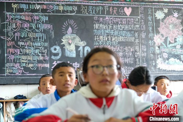 9月9日,西藏浪卡子縣中學(xué)一班級(jí)學(xué)生繪寫的教師節(jié)主題黑板報(bào),表達(dá)對(duì)老師的尊敬與感謝。中新社記者 江飛波 攝