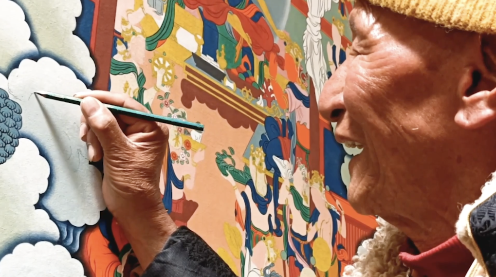 今年92歲高齡的嘎瑪?shù)吕绽先?,是唐卡嘎瑪嘎赤畫派第十代傳承人,曾被西藏自治區(qū)授予“唐卡藝術(shù)大師”等稱號。