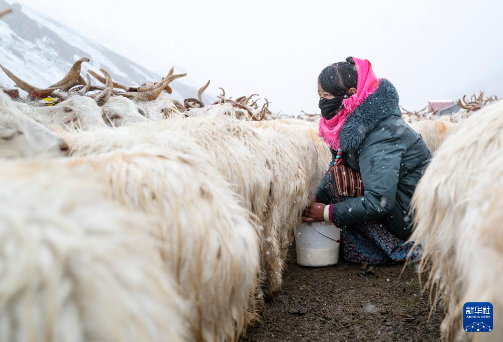 9月13日,在日土縣龍門卡村白絨山羊擴繁場,飼養(yǎng)員給白絨山羊擠奶。新華社記者 孫瑞博 攝