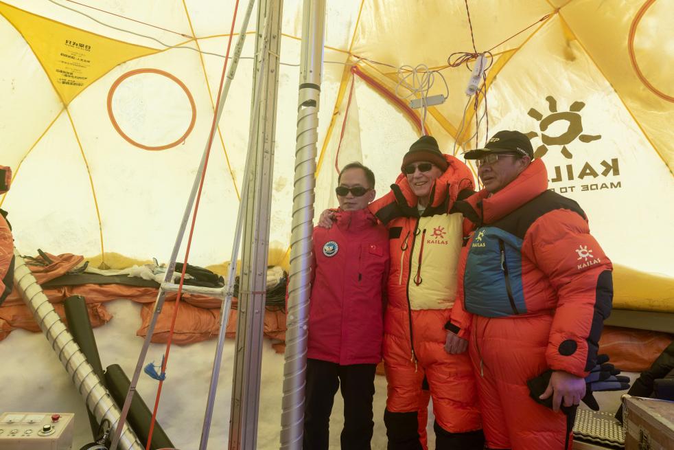 姚檀棟(左一)、湯普森(左二)在普若崗日冰原10號冰川冰穹C作業(yè)點工作帳篷內(nèi)與冰芯鉆取工作負責人徐柏青研究員合影。新華社記者姜帆 攝
