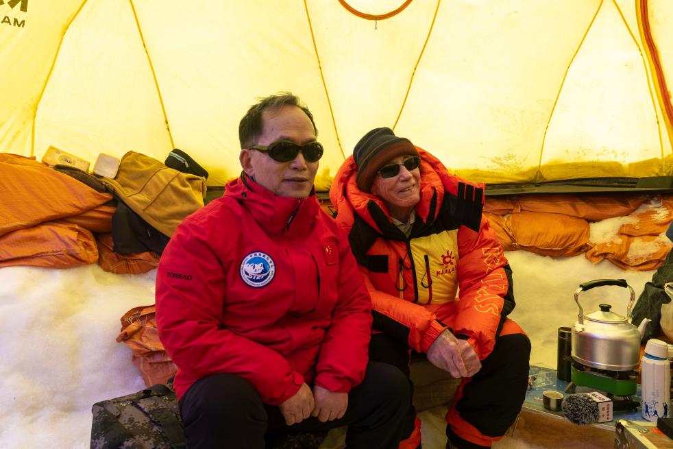 湯普森(右)、姚檀棟(左)在察看普若崗日冰原6號冰川冰穹A作業(yè)點返回營地后討論冰芯鉆取情況。新華社記者劉詩平 攝