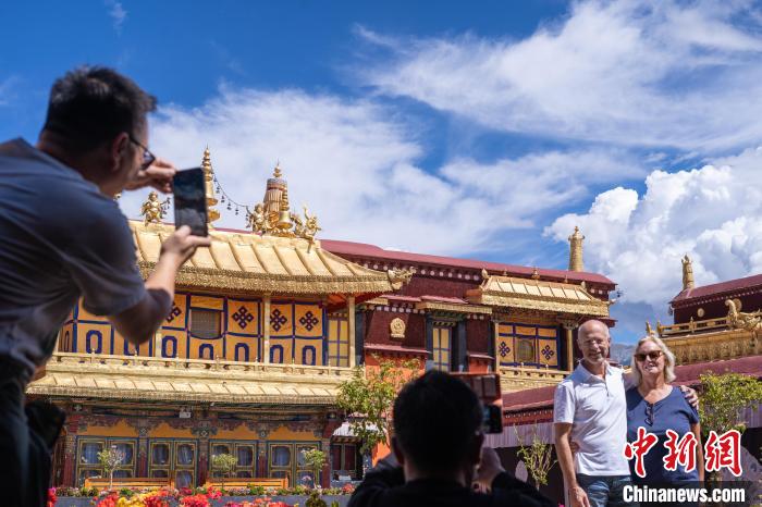 9月17日,外國游客在西藏拉薩大昭寺合影留念。中秋佳節(jié),距今已有1300多年歷史、2000年作為布達(dá)拉宮擴(kuò)展項目列入《世界遺產(chǎn)名錄》的拉薩大昭寺迎來眾多游客。中新社記者 貢嘎來松 攝