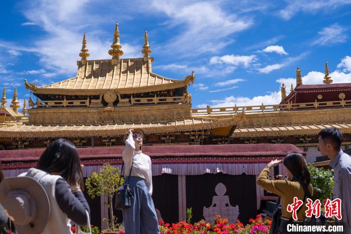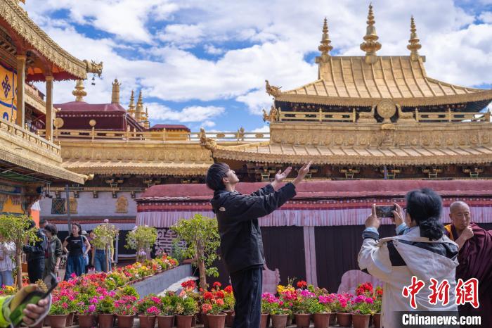 9月17日,游客在西藏拉薩大昭寺金頂前留影。中秋佳節(jié),距今已有1300多年歷史、2000年作為布達(dá)拉宮擴(kuò)展項目列入《世界遺產(chǎn)名錄》的拉薩大昭寺迎來眾多游客。中新社記者 貢嘎來松 攝